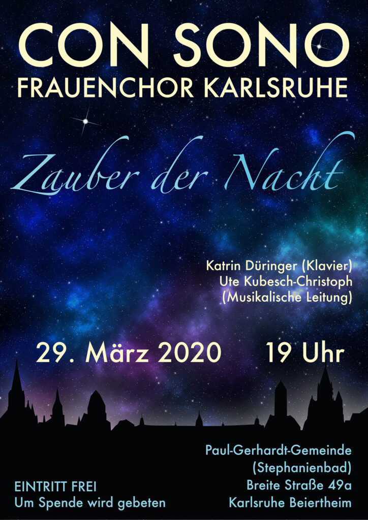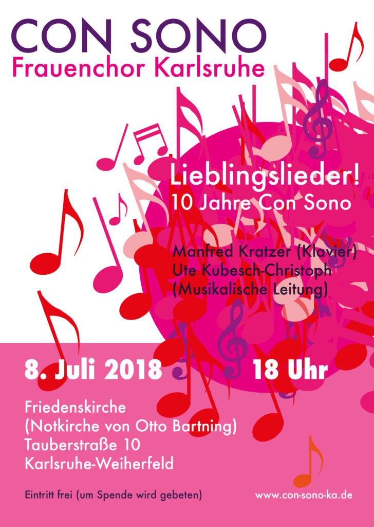 | 08.07.2018 | Lieblingslieder! 10 Jahre Con Sono, Jubiläumskonzert in der Friedenskirche (Notkirche von Otto Bartning), Karlsruhe-Weiherfeld (Programm) |