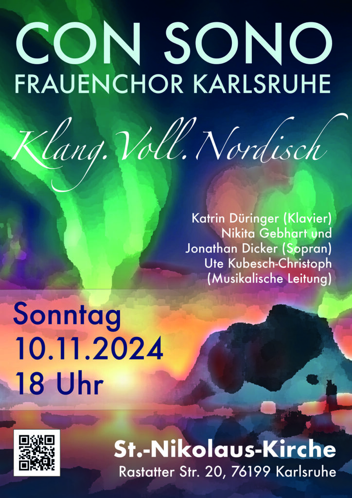| 10.11.2024 | Konzert KLANG.VOLL.NORDISCH, 18 Uhr, St. Nikolaus Kirche, Karlsruhe-Rüppurr (Programm) |